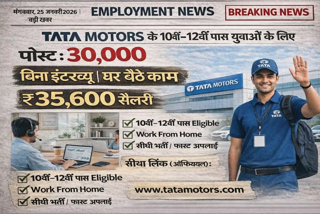 Tata Motors Work From Home Jobs 2026 को लेकर युवाओं के बीच तेजी से चर्चा हो रही है। सोशल मीडिया और कई वेबसाइट्स पर यह दावा किया जा रहा है कि टाटा मोटर्स ब्रांच के नाम पर 10वीं–12वीं पास युवाओं को घर बैठे काम दिया जा रहा है, जिसमें बिना इंटरव्यू चयन और ₹35,600 मासिक सैलरी मिलने की बात कही जा रही है। इस तरह की खबरें खासतौर पर बेरोजगार युवाओं, फ्रेशर्स और घर से काम की तलाश कर रहे लोगों को आकर्षित करती हैं, लेकिन आवेदन करने से पहले सच्चाई जानना बेहद जरूरी है।